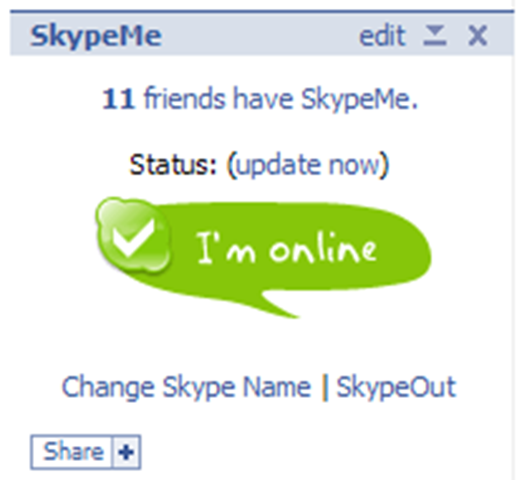 “SkypeMe is a Facebook application that links with your Skype account and lets you make calls right from inside Facebook. You can see which friends are online, make calls, and even buy SkypeOut credit from Facebook.”