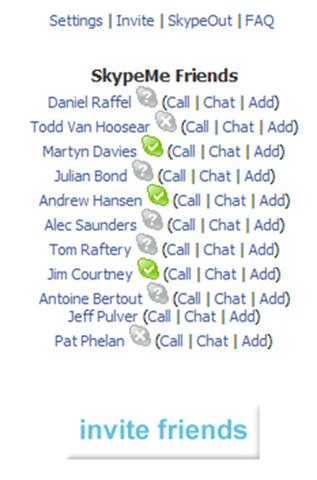 There’s actually two parts to it. On your public profile page visible to everyone else, there is a box like the image shown on the left that lets another Skype user initiate a call to you. On the internal page inside of my Facebook account for the applications I have installed, there is a page with a screen like the graphic on the right that shows all the Facebook friends I have who have also installed the SkypeMe Facebook application.
